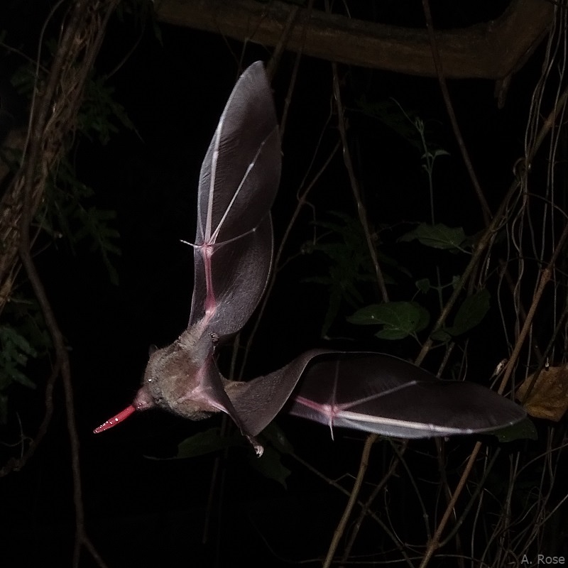 Flower visits are super short and usually do not last longer than one second. Here, a flower-bat is feeding on Bauhinia ungulata, a bat pollinated Fabaceae (Santa Rosa, Costa Rica):
